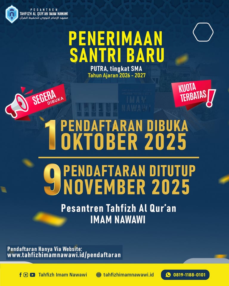 Pesantren Tahfizh Al Qur’an Imam Nawawi adalah lembaga pendidikan Islam yang berlandaskan pada aqidah Ahlus Sunnah wal Jamaah, dengan komitmen mencetak generasi penghafal Al Qur'an yang cerdas, berakidah lurus, dan berakhlak mulia.